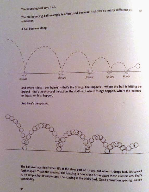 Throughout the entire book Williams talks about the priniciples of animation and gives many examples to help explain these principles, but there was example that I found very useful. Not only did it explain 'Squash & Stretch' and 'Timing & Spacing' really well, It also helped me a great deal when I came to do my second pose to pose animation. (It would have been really helpful for me when I was doing my first frame by frame flipbooks on squash and stretch too, had I have thought to look).